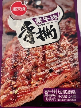 Соевое мясо, со вкусом говяжьего стейка и черного перца. Так же есть острота красного перца, средняя.